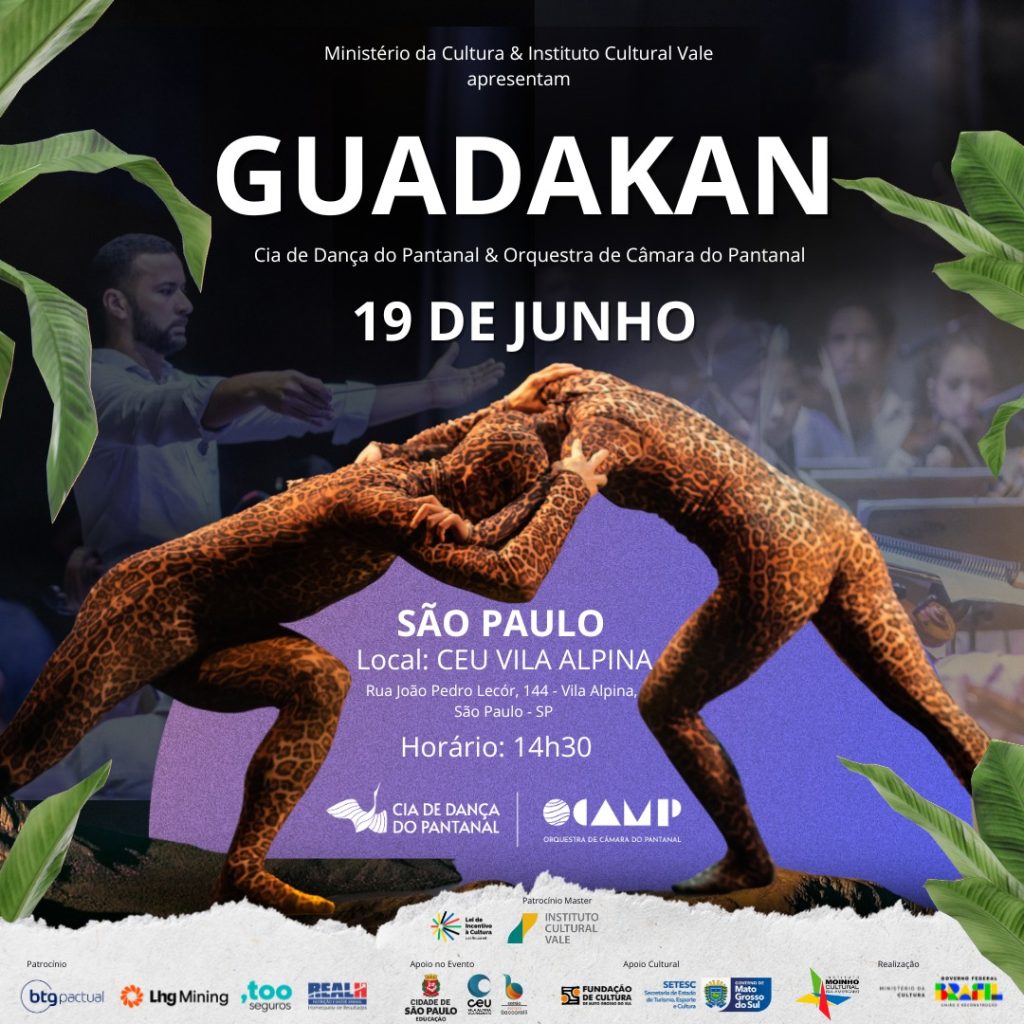 No mês de junho de 2024, mês em que se comemora o Meio Ambiente, a Companhia de Dança do Pantanal ( @ciadedancadopantanal ) e a OCAMP Orquestra de Câmara do Pantanal ( @ocampms ) desembarcam em São Paulo para uma turnê inédita do espetáculo “Guadakan”. O espetáculo é uma criação do Instituto Moinho Cultural Sul-Americano ( @moinho_cultural ), de Corumbá (MS), organização da qual ambos os coletivos fazem parte.