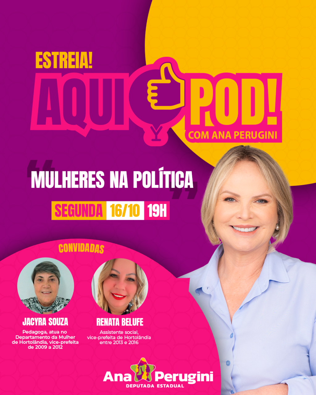 No AquiPod!, Ana Perugini vai receber convidados para abordar diferentes temas que afetam a vida das pessoas. A atração vai ao ar sempre às segundas-feiras e será transmitida pela página da deputada no Facebook – facebook.com/ana.perugini.