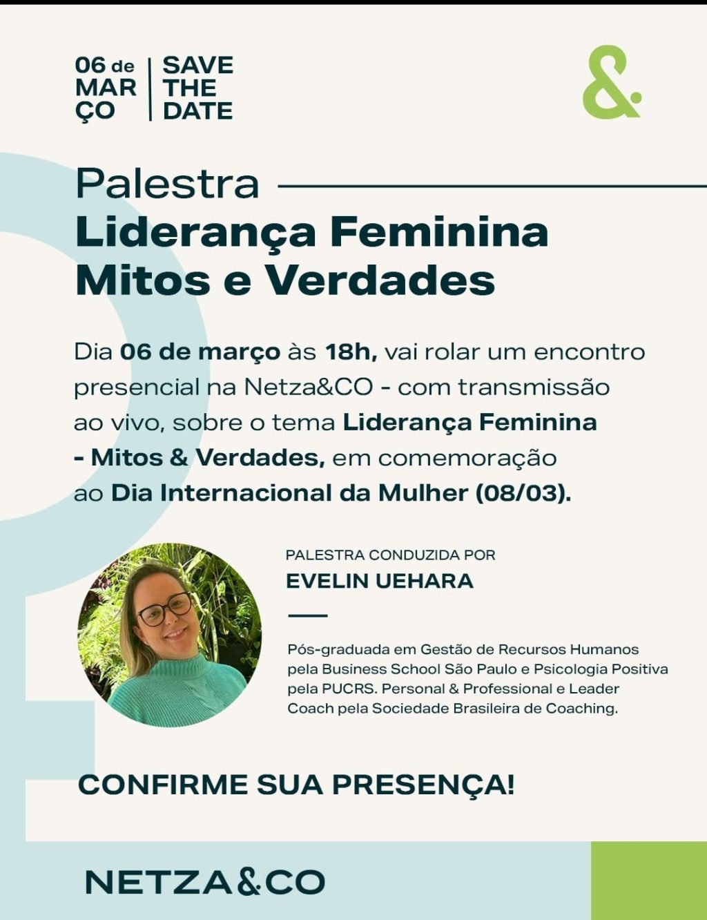 A Netza&CO aproveita o Dia Internacional da Mulher para refletir, trazer conteúdo e convidar todos e todas para um encontro especial. O ecossistema de soluções de marketing baseadas em inovação, tecnologia e princípios ESG, convidou Evelin Uehara – pós-graduada em Gestão de Recursos Humanos e Psicologia Positiva, Leader Coach pela Sociedade Brasileira de Coaching – para falar sobre “Liderança Feminina. Mitos e Verdades”.