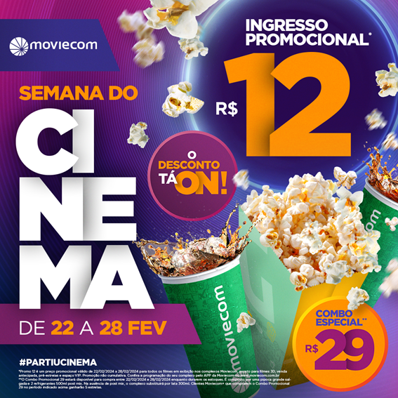 Entre os dias 22 e 28 de fevereiro, o Moviecom do Tivoli Shopping realiza a especial Semana do Cinema, quando os ingressos terão o preço único promocional de R$12. A ação é válida para todas as sessões nas salas tradicionais.