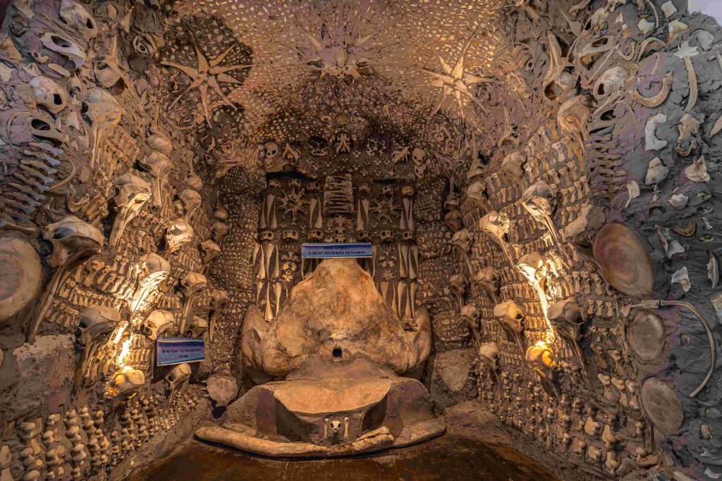 “Caverna dos Ossos” também compõe o espaço temático de impactos, e foi construída inteiramente com ossos de animais marinhos. (Créditos: Felipe Domingos/Instituto Argonauta)