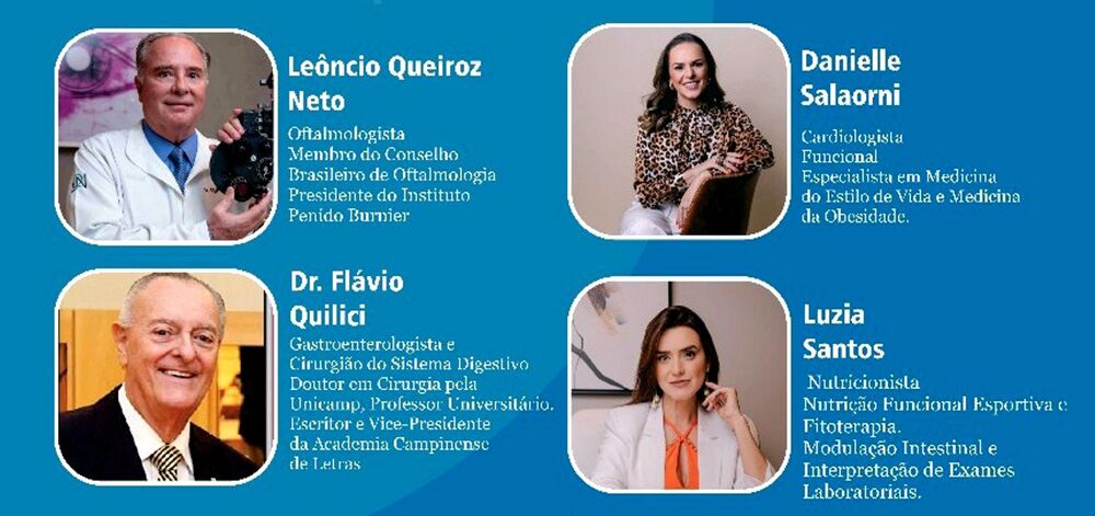 Os palestrantes apresentam vasto currículo no tema. Danielle Salaorni é cardiologista funcional e especialista em medicina do estilo de vida e da obesidade. Flávio Quilici é gastroenterologista e cirurgião do sistema digestivo, doutor em cirurgia pela Unicamp, professor universitário, escritor e vice-presidente da Academia Campinense de Letras. Leôncio Queiroz Neto é oftalmologista, membro do Conselho Brasileiro de Oftalmologia e presidente do Instituto Penido Burnier. Luzia Santos é nutricionista, especialista em nutrição funcional, esportiva e fitoterápica, modulação intestinal e interpretação de exames laboratoriais.