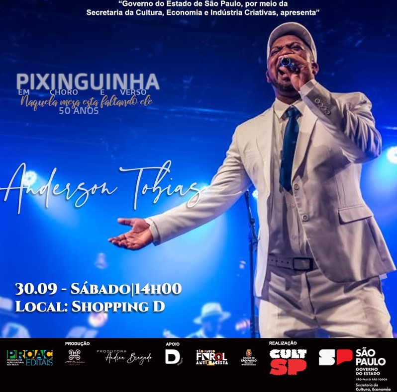 O Governo do Estado de São Paulo, por meio da Secretaria de Cultura e Economia Criativa, apresentaAnderson Tobias e banda no show em homenagem a Pixinguinha, nono Shopping D, em única apresentação, dia 30/09, às 14h.