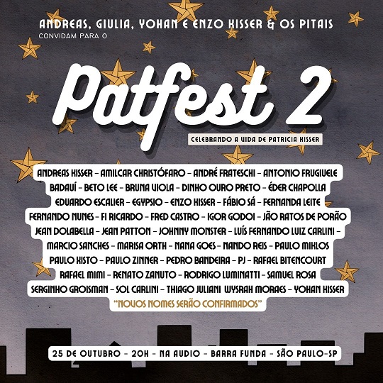 Entre familiares e amigos da música, Andreas Kisser eterniza o legado da empresária e produtora Patrícia Kisser com a segunda edição do Patfest. O festival solidário homenageia a vida de Pati, que faleceu há um ano, em decorrência de um câncer de cólon, com o encontro de lendários nomes da música brasileira, como Nando Reis, Samuel Rosa, Dinho Ouro Preto, Beto Lee e outros. No dia 25 de outubro (quarta-feira), os artistas se reúnem na Audio, em São Paulo, e todo o valor arrecadado com os ingressos será revertido para a ONG Comunidade Compassiva (acesse aqui).
