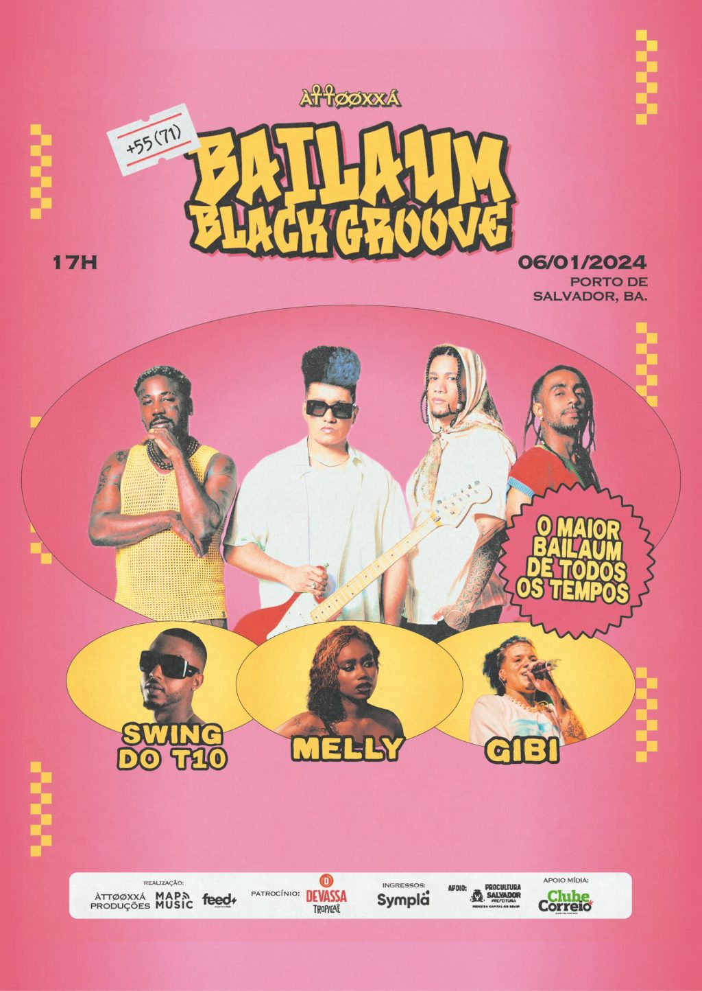 Para começar o ano com muito pagodão na pista, o ÀTTØØXXÁ apresenta uma nova edição do Bailaum: BAILAUM BLACK GROOVE, em Salvador. Conhecidos por promoverem verdadeiras catarses coletivas, RDD, Raoni, Oz e Chibatinha vão revisitar, ao longo de três horas, o repertório clássico do grupo, além de algumas prévias do que eles estão preparando para o Carnaval de 2024. Esta edição também marca a estreia em Salvador do show Groove, em que a banda apresenta as músicas de seu álbum homônimo, lançado em 2023. Para completar o line upMellySwing do T10 Gibi farão parte da festa. O encontro acontece no Porto de Salvador, no dia 06 de janeiro de 2024, e os ingressos já estão disponíveis (acesse aqui).
