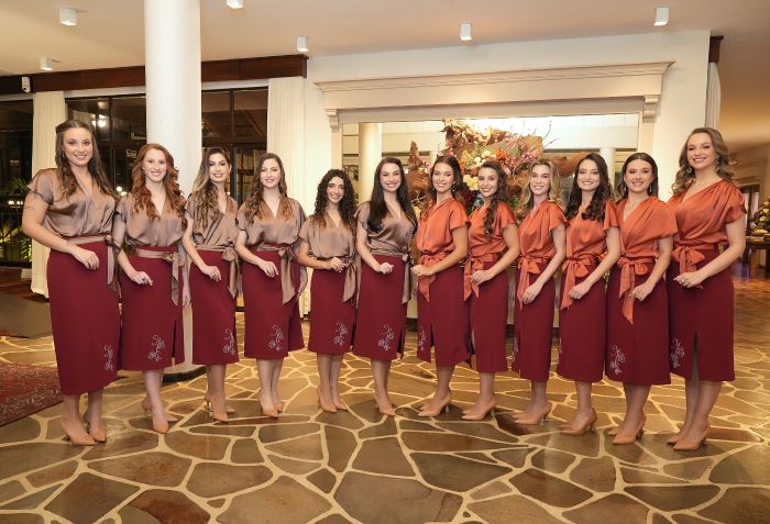 Com trajes especialmente criados pela estilista caxiense Ana Dotto, em parceria com a Comissão Social da Festa da Uva, as candidatas vestiram uma proposta que une história, identidade e elegância. Inspirado nos lenços utilizados pelas imigrantes – elementos de proteção, cuidado e vínculo com suas origens – o figurino faz referência ao legado cultural da Serra Gaúcha. A blusa, confeccionada em tecido acetinado, tem formas que remetem ao modo como os lenços envolviam o corpo. A saia, em crepe estruturado, traz bordados de uvas em fio de seda, valorizando o trabalho artesanal. “Na Serra, onde a uva é símbolo e herança, este traje veste memória e pertencimento”, resume Ana Dotto. Os tecidos foram fornecidos com apoio das Lojas Magnabosco e o visual é complementado por sapatos Luiza Barcelos e joias da Beretta.