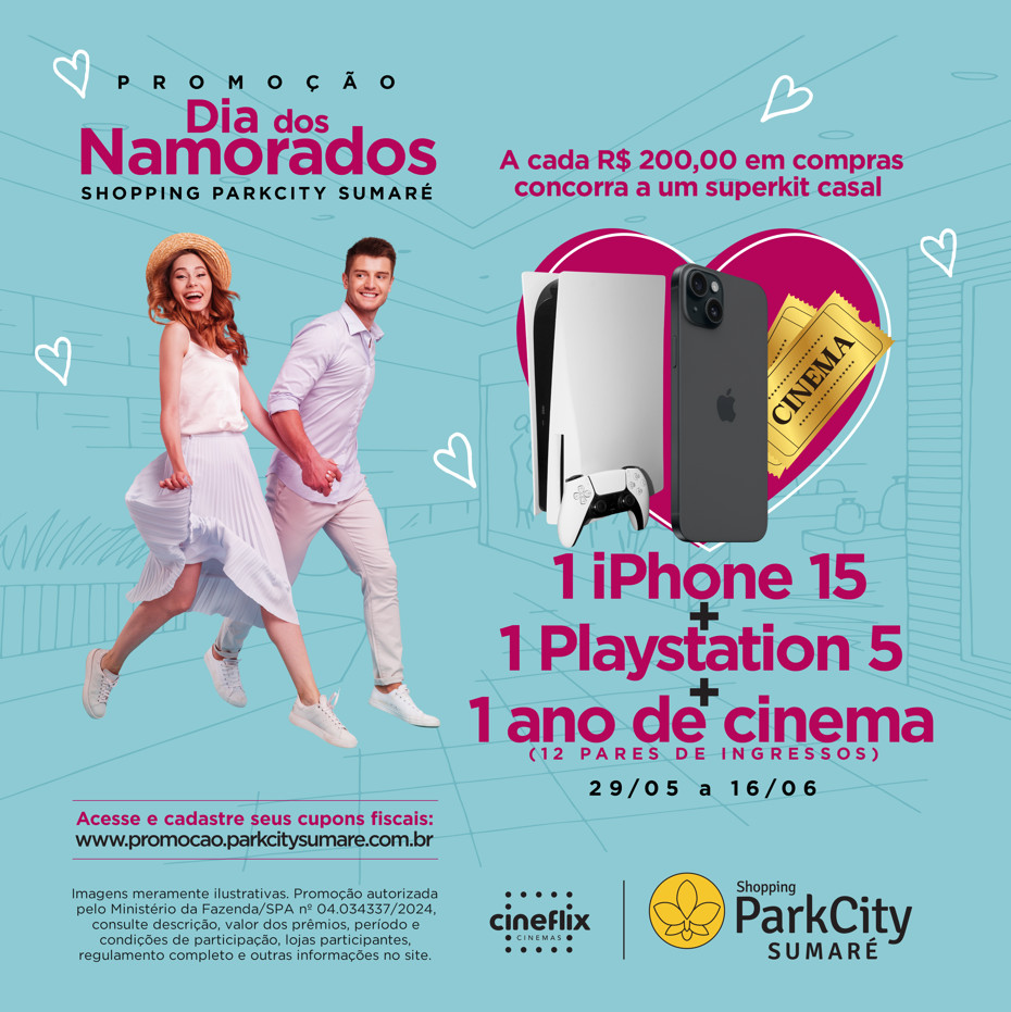 De 29 de maio a 16 de junho, a cada R$ 200,00 em compras nas lojas participantes, o cliente cadastra as notas fiscais no site da promoção e ganha um número da sorte para concorrer ao sorteio de um superkit casal, contendo: 1 iPhone 15 + 1 Playstation 5 + 1 ano de pares de ingresso para o Cineflix do Shopping ParkCity Sumaré, sendo limitado a 1 vez ao mês, por 12 meses consecutivos.