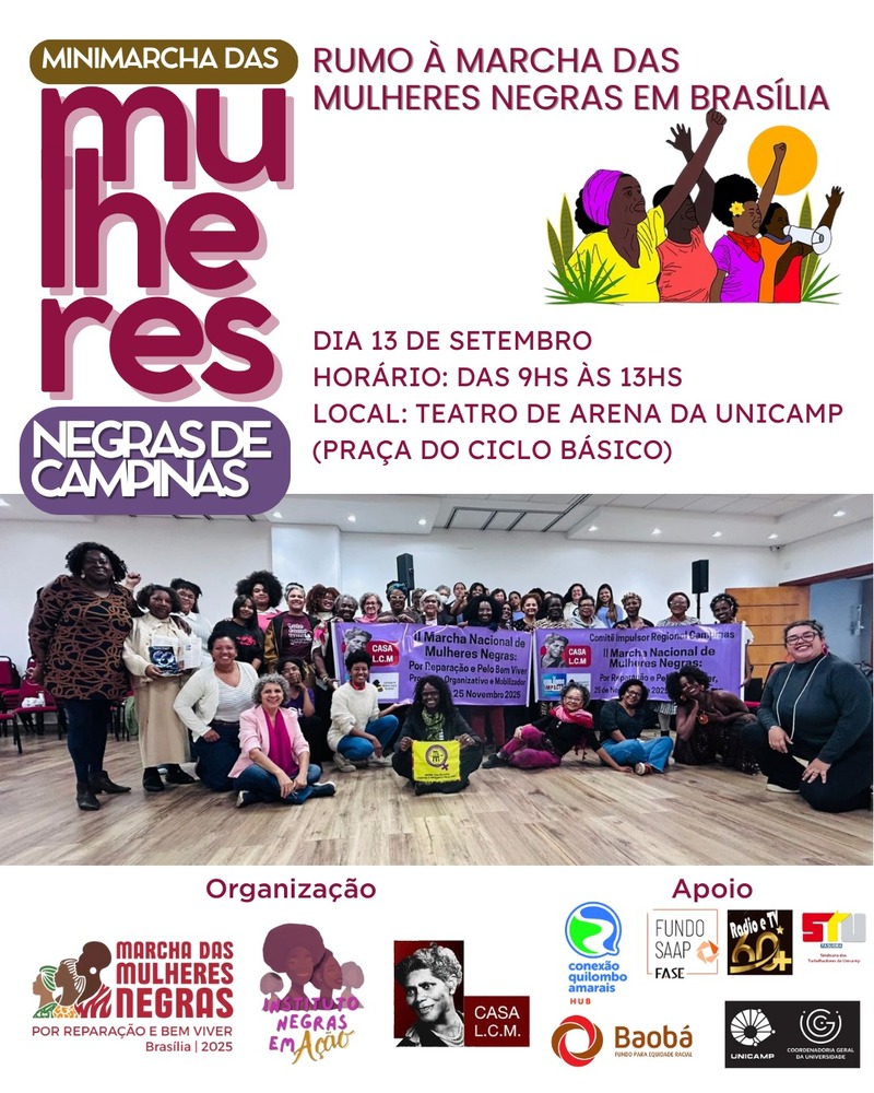 O Instituto Negras em Ação, a Casa Laudelina de Campos e o Comitê Impulsor de Campinas realizam a Minimarcha das Mulheres Negras de Campinas em 13 de setembro, das 9 às 13 horas, no Teatro de Arena da Unicamp. O evento conduz à Marcha Nacional, a ser realizada em Brasília, dia 25 de novembro. A programação, gratuita, contará com rodas de conversa com representantes de diferentes regiões, atividades culturais e preparação para a participação na Marcha Nacional.