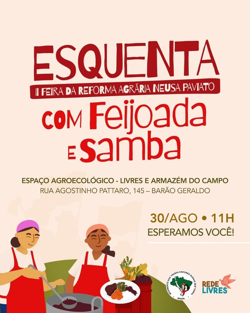 O Espaço Agroecológico – Livres e Armazém do Campo, em Barão Geraldo, traz nesse sábado, dia 30 de agosto, uma saborosa feijoada com samba a partir das 11h. No evento haverá feijoada tradicional e a opção vegana. A loja é uma parceria entre o Livres Agroecologia e o Armazém do Campo, rede de produtos da Reforma Agrária Popular do MST (Movimento dos Trabalhadores Rurais Sem Terra).
