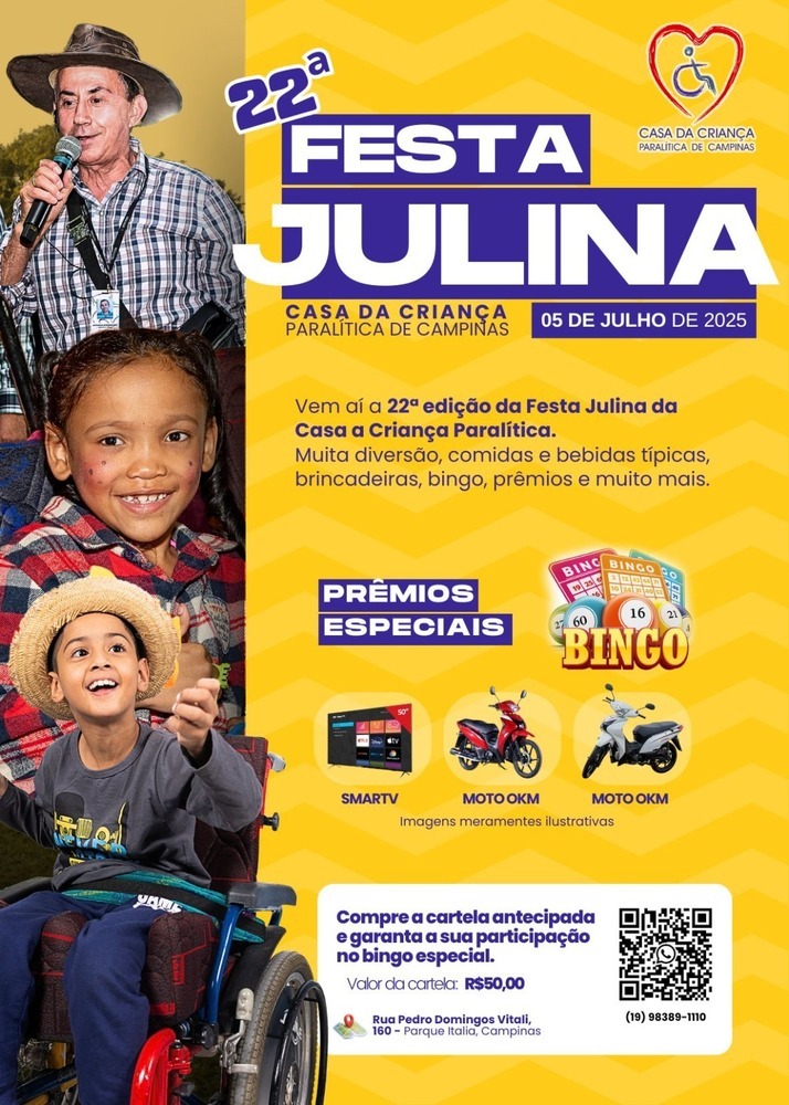 A Casa da Criança Paralítica (CCP) realizará a sua tradicional festa julina no dia 5 de julho (sábado), das 12 às 22 horas, na sede da instituição, localizada à Rua Pedro Domingos Vitalli, 160, em Campinas (SP). A expectativa é receber um público de aproximadamente 4 mil pessoas. Entre as atrações previstas nesta 22ª edição está o sorteio de duas motos zero quilômetro e uma smart TV, durante as três rodadas especiais do bingo que ocorre durante o evento.