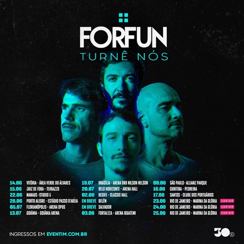 Assim que anunciou o retorno aos palcos, o Forfun divulgou datas de shows em São Paulo e no Rio de Janeiro – ambas concorridíssimas (só na capital fluminense, 40.000 ingressos esgotaram de prontidão). Agora, chegou a hora de novas praças serem confirmadas como destino da turnê NÓS. São 14 novas datas por todo o Brasil. A tour, inclusive, terá sua estreia marcada para o dia 14 de junho, na Área Verde do Álvares, em Vitória (Espírito Santo). Idealizada pela 30e, a tour se estende até 30 novembro, quando o grupo encerra a sequência de apresentações no Engenhão, no Rio de Janeiro. A venda de ingressos começa amanhã, dia 16 de janeiro, a partir do meio-dia, na Eventim. Vale lembrar que ainda restam poucos ingressos para a data em São Paulo, dia 9 de agosto, no Allianz Parque.