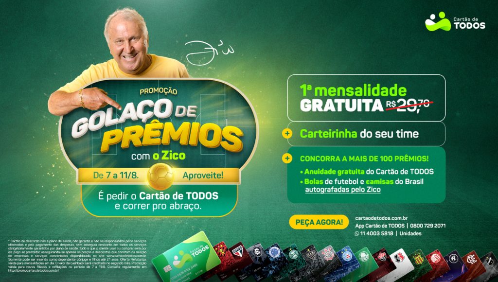 Em clima de jogos e embalado pelas competições em Paris, o Cartão de TODOS, maior cartão de descontos do Brasil, acaba de lançar a promoção “Golaço de Prêmios com o Zico”, que vai presentear novos filiados ao aderirem aos serviços da marca, oferecendo benefícios nas áreas de saúde, educação e lazer. A ação é uma oportunidade para que as famílias possam cuidar da saúde pagando menos, já que 83% dos brasileiros acreditam que muitas pessoas não conseguem pagar por uma assistência médica de qualidade, segundo a pesquisa “Global Health Service Monitor 2023”, realizada pelo Instituto Ipsos.
