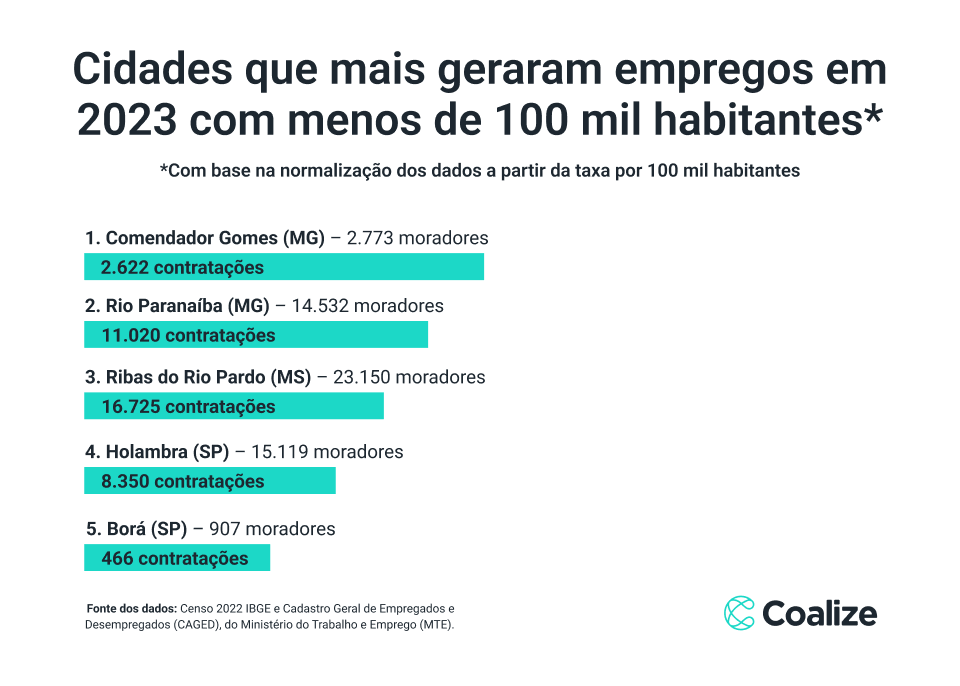 Para elaboração do ranking das cidades que mais geraram empregos no país em 2023, a Coalize reuniu todos os 5.571 municípios registrados na base de dados do MTE e normalizou os dados, dividindo os números de admissões por 100 mil habitantes, para que todas as cidades pudessem competir em pé de igualdade, mesmo que a densidade populacional fosse menor do que a de grandes cidades, dessa forma, os resultados são proporcionais ao número de habitantes de cada localidade apresentada no estudo.