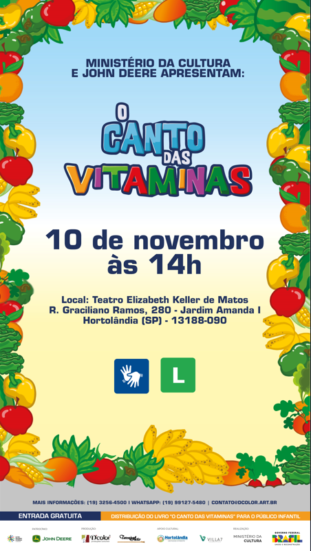A peça O Canto das Vitaminas – A Viagem de Polyana é viabilizada pelo Ministério da Cultura, por meio da Lei de Incentivo à Cultura do Governo Federal, com patrocínio da John Deere e realização da D’Color Produções Culturais, que atua no mercado de produção cultural, assessorando, planejando e executando projetos. O Teatro Elizabeth Keller de Matos fica na rua Graciliano Ramos, 280 – Jardim Amanda I – Hortolândia (SP). Mais informações pelo telefone (19) 3256 4500, WhatsApp (19) 99127 5480 ou pelo e-mail [email protected].