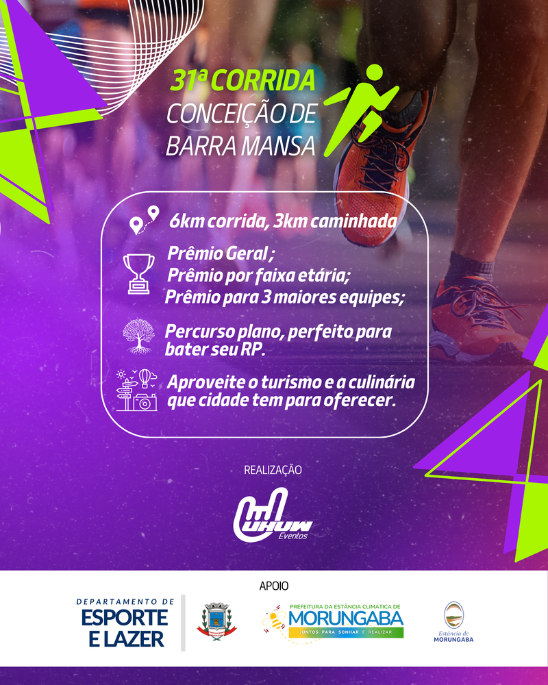 A tradicional Corrida Conceição de Barra Mansa está com inscrições abertas para a sua 31ª edição, marcada para o dia 29 de junho, um domingo, com largada às 7 horas da manhã. O evento é organizado pela UHUW Eventos com o apoio da Prefeitura da Estância Climática de Morungaba, por meio do Departamento de Esportes e Lazer.