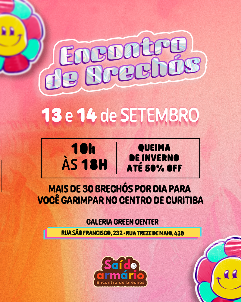 Nos dias 13 e 14 de setembro, das 10h:00 às 18h:00, a Galeria Green Center recebe mais uma edição do Encontro de Brechós Saí do Armário, evento que já se consolidou como um dos maiores pontos de encontro da moda circular em Curitiba. Serão 29 brechós por dia, reunindo uma seleção de peças a partir de R$10, em todos os estilos e tamanhos, além de uma liquidação de inverno com descontos de até 50%.