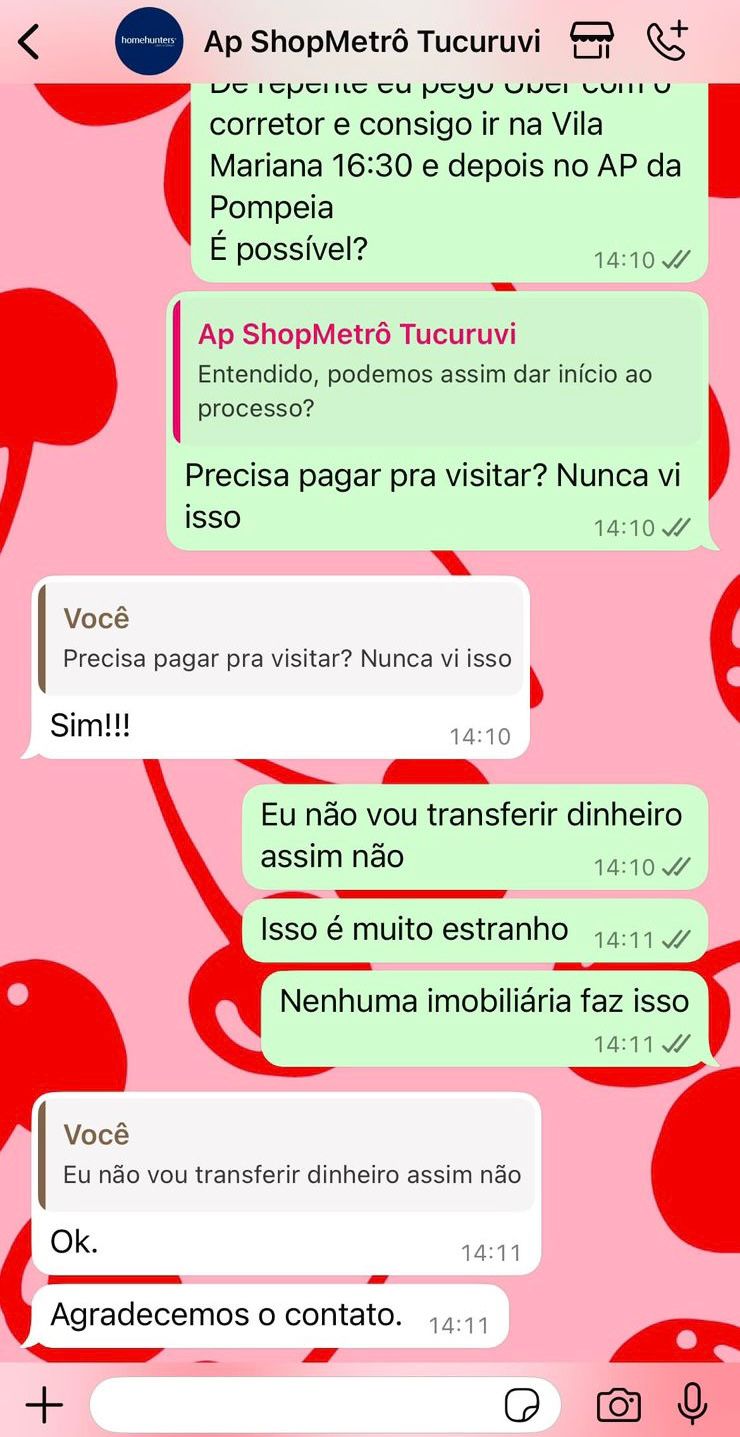 Como forma de alertar o consumidor, a imobiliária homehunters divulga de forma sistemática em suas redes sociais que não cobra taxa por visita em imóveis. “Estamos cientes de indivíduos mal-intencionados que estão utilizando nossa marca para aplicar golpes”, destaca o aviso.