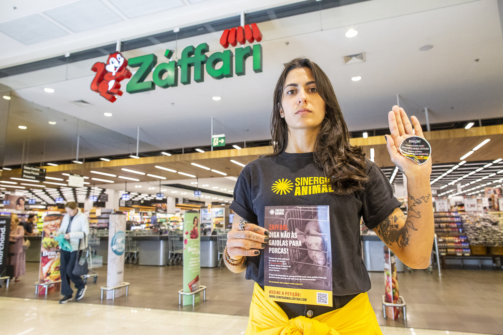A organização internacional de proteção animal Sinergia Animal realizou uma ação pacífica na unidade do supermercado Zaffari Morumbi Town, na zona sul de São Paulo. A intervenção teve como objetivo conscientizar os consumidores sobre práticas de bem-estar animal na indústria suína e pedir que o grupo Zaffari publique um compromisso formal para eliminar o uso das controversas gaiolas de gestação para porcas reprodutoras em sua cadeia de fornecimento.