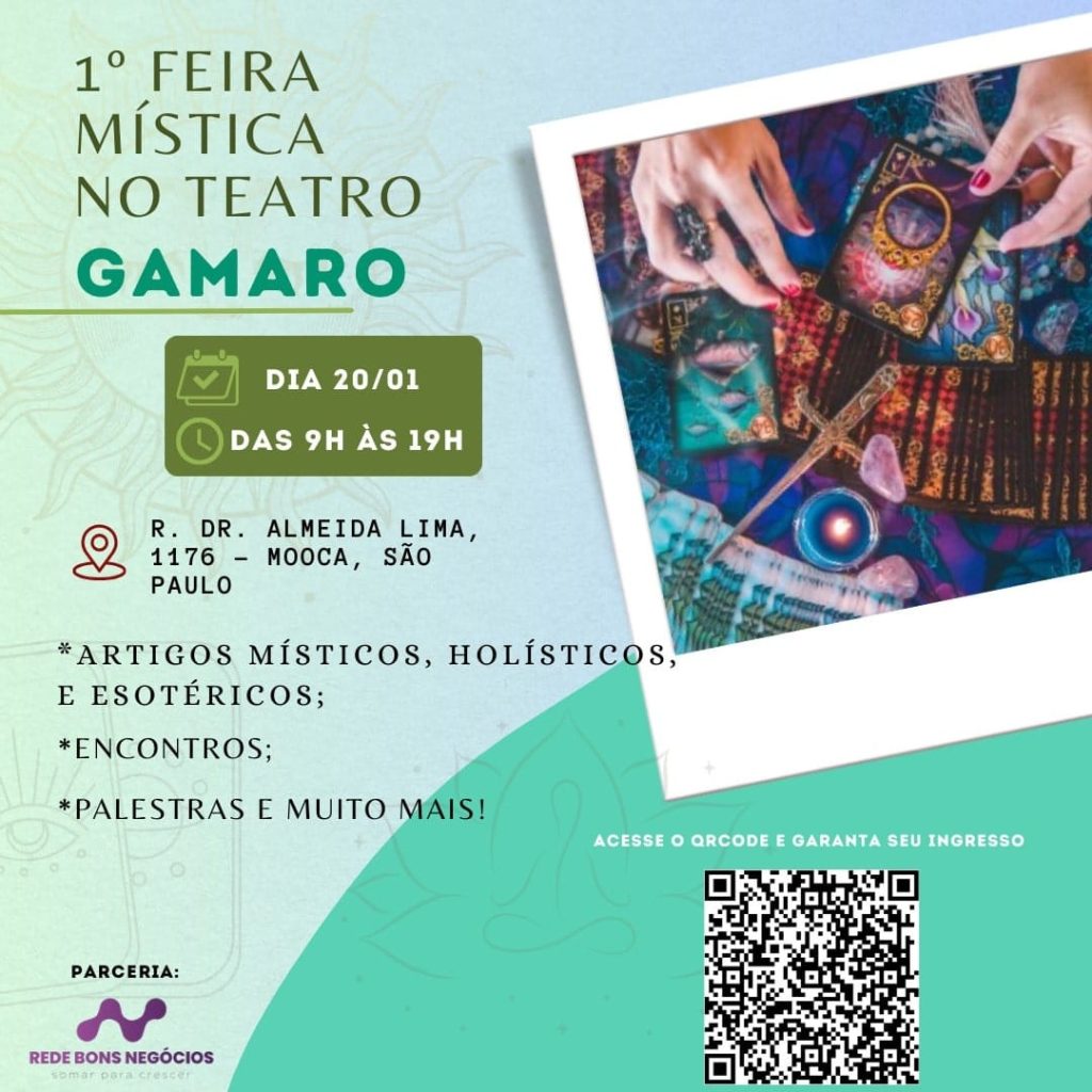 A 1ª Feira Mística no Teatro Gamaro será das 9h às 19h e os ingressos a R$ 10,00 já podem ser adquiridos em : https://www.sympla.com.br/evento/1-feira-mistica-no-teatro-gamaro/2240874 Haverá, ainda, opção de compra na porta ou entrada em troca de 1kg de alimento não-perecível (exceto sal ou açúcar). O endereço é R. Dr. Almeida Lima, 1176 – Mooca, São Paulo e a página oficial do Instagram é @teatrogamaro