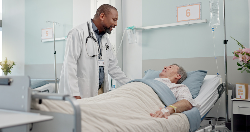 Consultation, healthcare and doctor with patient in hospital after surgery, treatment or procedure