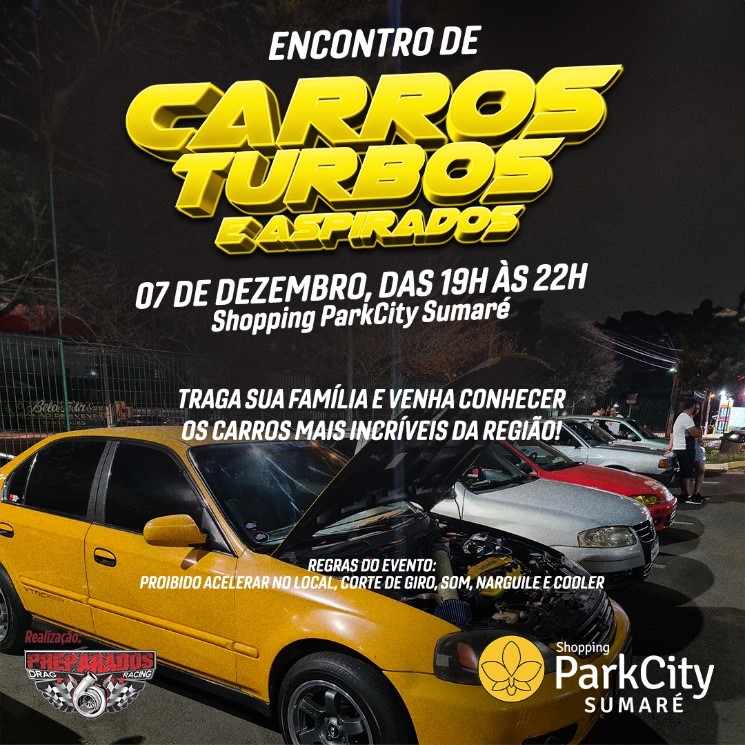 O Shopping ParkCity Sumaré promove nesta quinta-feira, 7 de dezembro, o último Encontro de Carros Turbos e Aspirados do ano. O evento, em parceria com Preparados Drag Racing, é gratuito e será realizado das 19h às 22h.