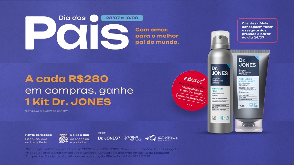 Para celebrar o Dia dos Pais com estilo e cuidado, o Shopping Parque das Bandeiras lança uma campanha especial entre os dias 28 de julho e 10 de agosto. Durante esse período, os consumidores que realizarem R$ 280 em compras poderão trocar suas notas fiscais por um kit exclusivo da marca Dr. Jones, um presente prático e sofisticado para homenagear os pais, contendo uma Espuma de Barbear Hidratante Precision Foam de 160ml e Gel Pós-Barba Recharge After-Shave 75ml.