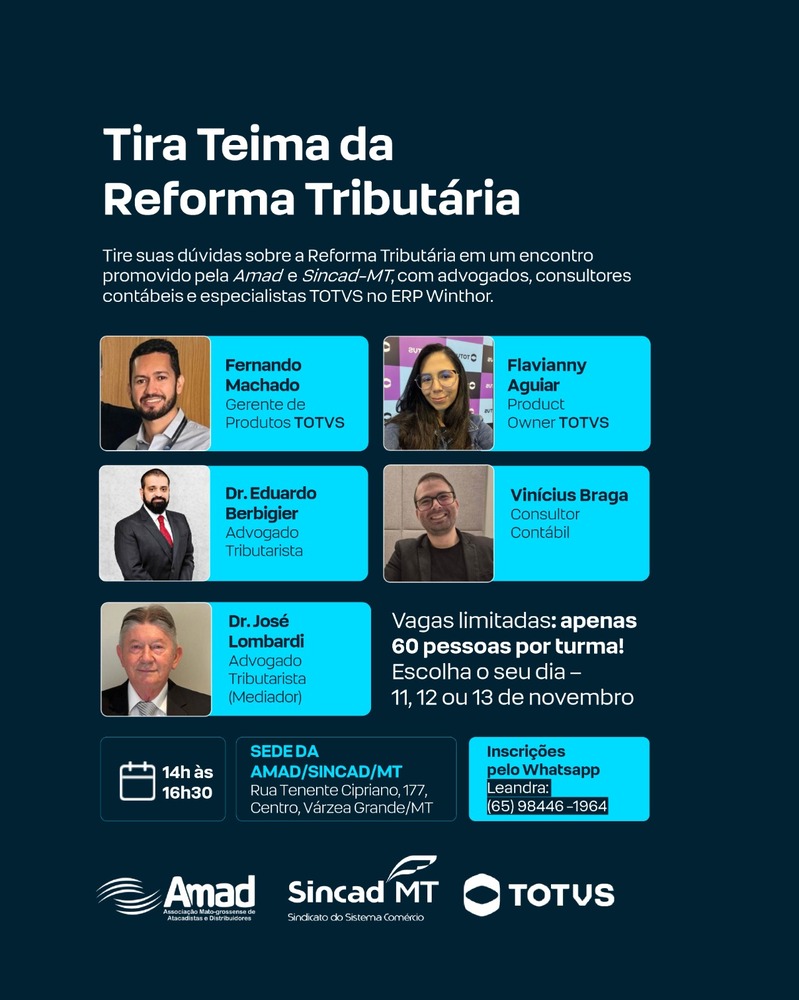 Além de Berbigier, os painéis contarão com as participações dos especialistas: José Lombardi (advogado tributarista), Vinícius Braga (consultor contábil), Flavianny Aguiar (Product Owner na TOTVS) e Fernando Machado (Gerente de Produtos da TOTVS).
