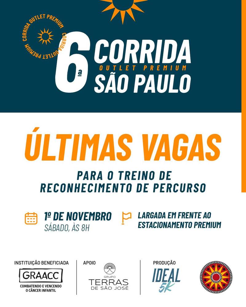 Para aqueles que ainda não garantiram a participação para a 6ª Corrida do Outlet Premium São Paulo, as inscrições seguem abertas até o dia 03 de novembro (segunda-feira). Além de promover o bem-estar e a saúde, a corrida destina parte do valor arrecadado com as inscrições para o Hospital do GRAACC, referência no atendimento a crianças e adolescentes com câncer.