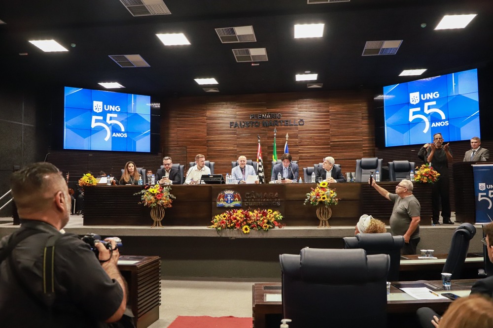 A Universidade Guarulhos (UNG) comemorou, nesta terça-feira (2), seu jubileu de 55 anos em uma solenidade realizada na Câmara Municipal da cidade. O evento reuniu o fundador do Grupo Ser Educacional e chanceler da instituição, José Janguiê Bezerra Diniz, o reitor Yuri Neiman, além de autoridades políticas, lideranças acadêmicas, representantes da sociedade civil e ex-alunos para celebrar a trajetória da instituição, considerada uma das mais relevantes do município e da região metropolitana de São Paulo.