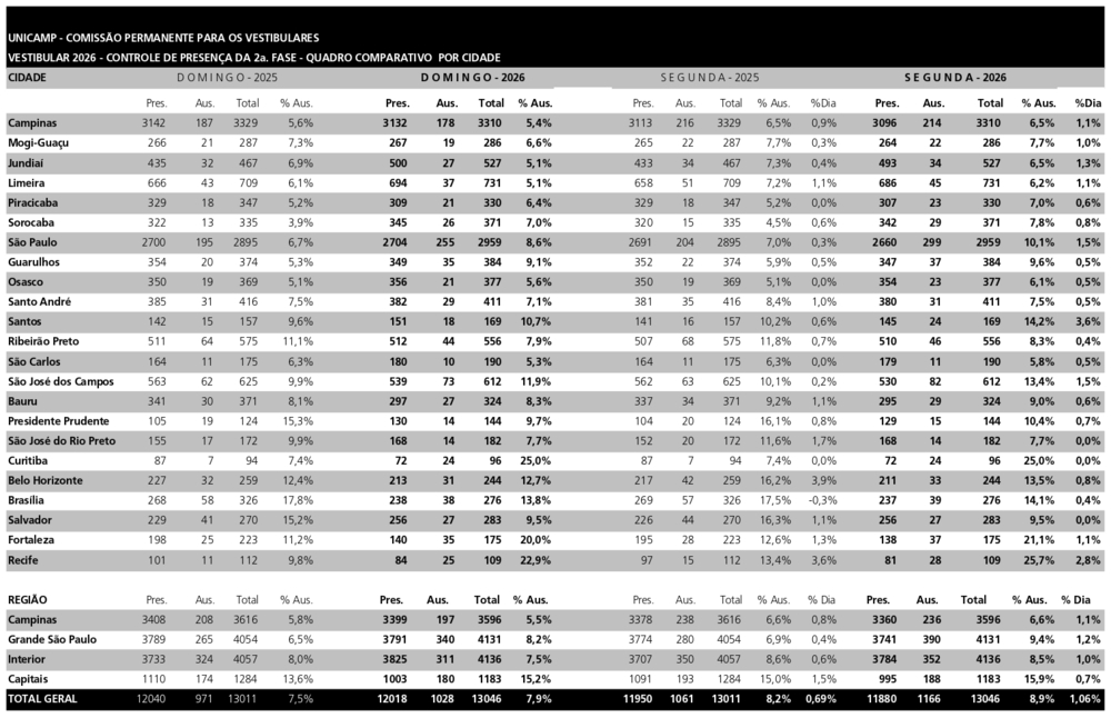 A menor abstenção do segundo dia da segunda fase foi registrada na cidade de São Carlos, com apenas 5,8% de ausentes. Em Campinas, a abstenção também ficou abaixo da média geral, com 6,5% de ausentes. Em São Paulo, a abstenção foi de 10%. A tabela completa com os índices por cidade está disponível na página do Vestibular 2026. A Unicamp realizou a segunda fase nas seguintes cidades de São Paulo: Bauru, Campinas, Guarulhos, Jundiaí, Limeira, Mogi Guaçu, Osasco, Piracicaba, Presidente Prudente, Ribeirão Preto, Santo André, Santos, São Carlos, São José do Rio Preto, São José dos Campos, São Paulo, Sorocaba. Fora do Estado de São Paulo, receberam as provas do Vestibular Unicamp seis capitais: Belo Horizonte, Brasília, Curitiba, Fortaleza, Recife e Salvador.